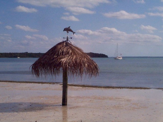 We also visit Settlement Harbour on Great Guana Cay. The restaurant, Nipper's, does a tremendous job selling itself, especially for the Sunday pig roast. We eat lunch there on Saturday, but the food is poor (bugs in the salad, yuck) and it's awfully loud; we don't care to hang out at their salt-water pool and drink expensive rum punch. For Sunday, we stop there briefly to observe the pig roast (we bring a bag lunch) but spend the rest of the day at the Dolphin Beach Resort, with a fresh water pool, beautiful beach, and lounge area. We have made dinner reservations at the Mermaid Cafe, and our dinner (fresh lobster, fresh grouper, fried chicken, and Caeser salad) is delicious; by far the best food and service we have in the Abacos!
