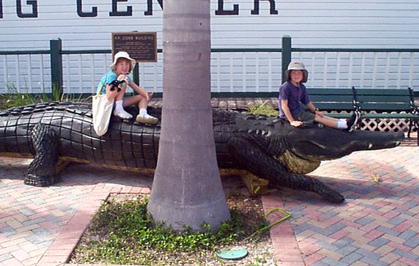 On Monday, we're back at anchor. We'll be here another day, exploring Ft. Pierce and also waiting for a good forecast to go offshore up to St. Augustine. A hike along railroad tracks brings us to downtown Ft. Pierce and the "Manatee Museum." The only manatee we see is this one decorated with shells. There are no other manatees to be seen, even in the power plant basin just beside the museum, where a manatee was seen only this morning! We don't think we'll ever get to see one, but we do avail ourselves of manatee educational materials which we can use for our school reports. We also find a huge alligator - one bite from this one could take your 'ole 'ead off!