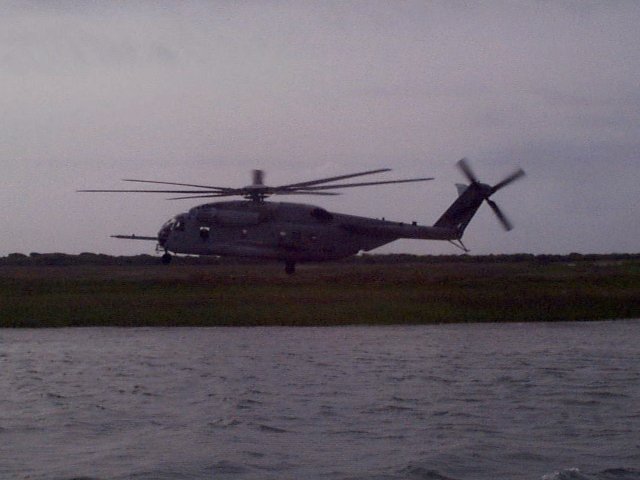 No manuevers happen overnight, but the next day, while on the ICW, we see helicopters and planes. We hear 'choppers in the distance; they rapidly catch up with us, and one puts down on a marshy bank about 50 yards away! Luke announces, "Those are Super Stallions!" and gets his Marine Corp aviation book to show us. With a payload capacity of 32,000 pounds, those helicopters could almost lift our boat! If we didn't already have the sails down, we'd probably take them down now, since the nearby helicopter churns up the water and sends debris flying our way.