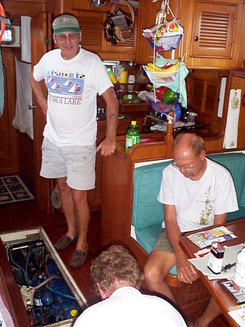 After the windlass is repaired, it is time to tackle some engine work. Our Perkins diesel has been gradually increasing its oil consumption, and even though we've been told that "Perkins' engines seep oil," we'd like to get consumption back down again. This means replacing several seals and gaskets. Of course, nothing ever goes smoothly, and it really helps to have John, a retired machinist and a fellow Perkins owner, as our neighbor. Hanging down to work on the engine gets tiring, but at least we have access. A stud breaks off in the engine block, and Adrian spends several hours extracting it. We plan on cleaning the engine, and putting a fresh coat of paint on various parts. Hopefully, the engine will run well, and smell "fresh" when we're done!
