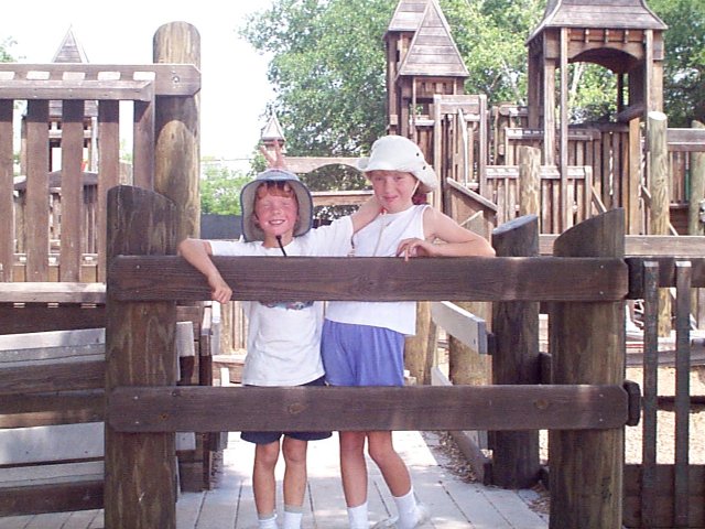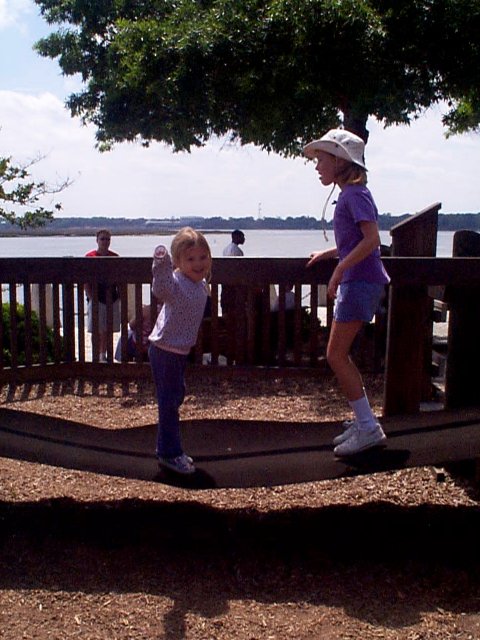 A walking tour of the historic district reveals beautifully restored mansions, and Beaufort's downtown has numerous interesting (and expensive) boutiques. We happily browse and patronize a coffee shop and an ice cream parlor. The downtown area is waterfront, and a huge wooden playground has been built right next to the water. While the kids play, we can drink our coffee and enjoy the comfy benches. Kristina and Luke meet another red-haired child, Cheyenne, whose parents deliver boats, and the kids have a great afternoon together. Cheyenne invites our children onto her boat to show them her menagerie of hermit crabs. Kristina says she is the "cruisingest kid she's met" and hates to see her leave.