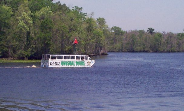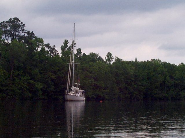 We are very ready for lunch when the "Welcome to Bucksport" sign becomes visible, and we look forward to the air conditioning! The restaurant is quite crowded; a large tour group has stopped for lunch. They'll be riding on the amphibious bus tour, which later we watch launch and start down the Waccamaw River. The little restaurant is overwhelmed, and we wait for our food to be served. Our lunch outing easily stretches to several hours, and by the time we have walked around Bucksport a bit, and battled the current (which is against us on the return trip, too, of course), it is late afternoon by the time we return to Canto. To our dismay, Canto has swung all the way over to one side of the creek, and the stern is hung up in the overhanging branches and vines. (How did this happen? There is no wind! We suspect a fast moving powerboat left quite a wake, and in the otherwise still creek, it, plus the fact that we had out too much anchor rode, caused the boat to swing way over to the creekbank. We took in some rode and put a kellet on the anchor line to keep from having a repeat occurance.) To free Canto, we use the machete to hack away the branches and vines wrapped around the wind generator, the solar panels and the bimini. Whew, no snakes. . . but lots of spiders. With the dinghy, we push the boat back out to the middle of the creek. No damage has been done, but the cockpit is littered with leaves and branches. We clean up and retire by the lights of the fireflies and the sounds of frogs and whipporwills.