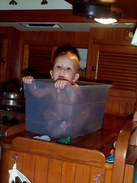 We're making do in Georgetown, but it doesn't turn out to be the place where we feel we can hang-out for a season, plus it's expensive (RO water is outrageous at $0.60/gallon), so we start looking for a window to move on. It can be cool, so Paul's baths are inside; however, he splashes a lot and gets the seats wet! Angie's arm is feeling better, but before the cast comes off, the arm needs to be X-rayed. The next nearest X-ray facility (that the ER physician in Nassau knew about) is in the Turks and Caicos Islands, but Angie is adamant that the cast needs to come off at 6 weeks, and we can't make the T&C before then. So, we look for an X-ray machine in Georgetown. There is no working X-ray machine at the local clinic, but another cruiser tells us to call the vet. What do you know? The local vet (an American ex-pat who brought his horse X-ray equipment with him from Michigan) X-rays more humans than anything else! Dr. Bill reads the X-ray and confirms a suspicion: a fall Angie took probably caused a re-break of the arm, and he consults with an orthopedic friend via email. Angie's still adamant - 6 weeks and it's off!